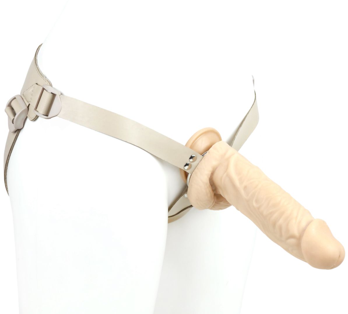 Пояс–кольцо: универсальный для реалистиков с присоской и плагов. Обновленная версия пояса, снабженная кожаным бандажным поясом на бархатном основе и фастексами-быстросьемами. Модель подходит как мужчинам, так и женщинам. Регулируется по форме тела всего один раз. Дальше просто расстегивается с помощью пряжек-фастексов и надевается в следующий раз, как готовое лекало. Металлическое кольцо в конструкции харнесса - позволяет использовать любые фаллоимитаторы с присоской и большинство плагов. В данной комплектации пояс предлагается в телесной цветовой гамме как насадки, так и фаллоимитатора. Размер пояса - 40-64.